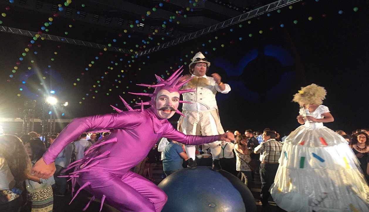 Los 2500 asistentes disfrutaron de una cena tipo cóctel que se amenizó con variedad de actividades, dignas de un cumpleaños de lo más divertido: hinchables, futbolines humanos, photocall virtual, un original Twister a gran escala y zonas chill out para darse un respiro de tan trepidante diversión. Todo ello envuelto en la magia y la estética del circo contemporáneo con una veintena de zancudos, acróbatas de suelo y sobre bola, artistas de globoflexia que interactuaban con los asistentes animándoles a participar y probar las actividades.