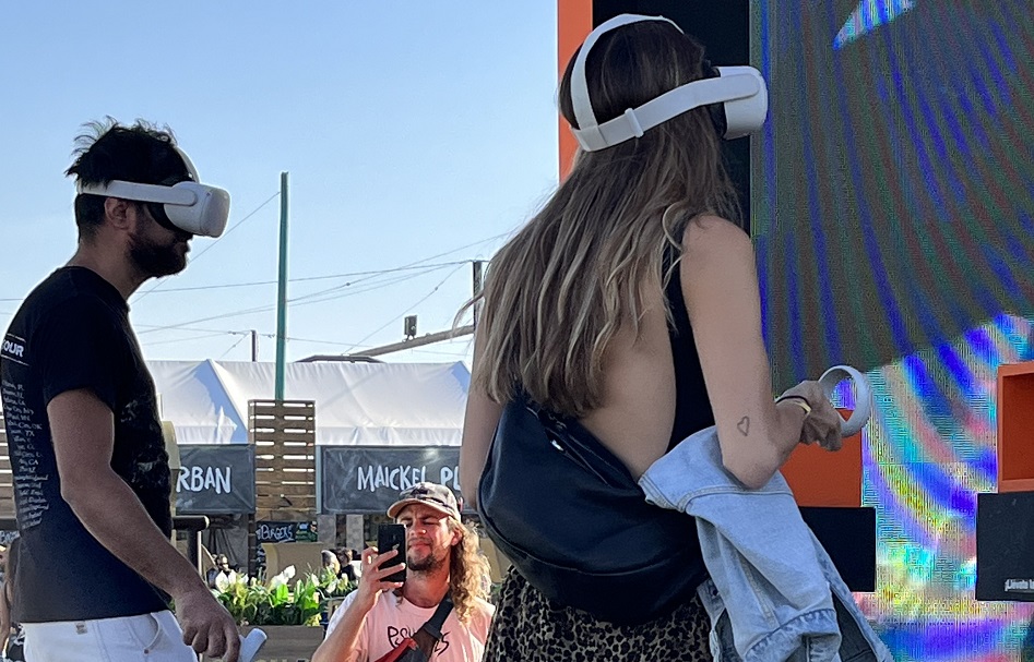 Las marcas han aprovechado el filón y han querido estar presentes ofreciendo experiencias: videos 360, experiencias en el metaverso, photocalls de todo tipo…. Y mucho merchandising… Por ejemplo Brugal montó su propio bar con un dj en directo, José Cuervo puso un bus amarillo de dos plantas en el que servían margaritas con un rooftop y una cámara 360, Orange ofreció una experiencia en el metaverso con juegos y música, Newblue instaló un enorme columpio con palmeras como photocall, Cervezas Alhambra tenía un puesto en el que una artista de la rotulación escribía mensajes personalizados en pai-pais … y así podría seguir hasta el infinito.