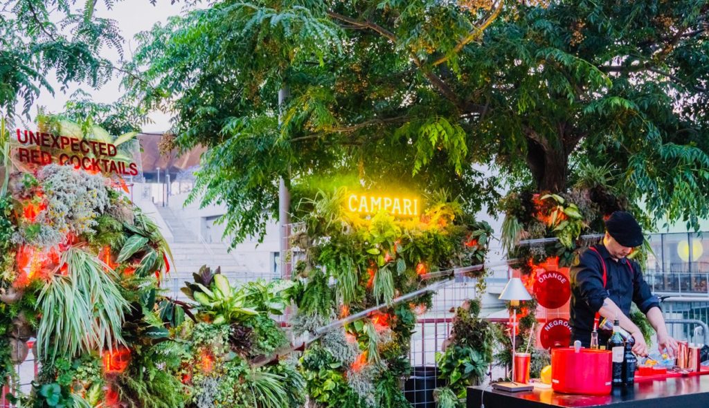 La combinación de lo natural y lo artificial se proponía como un juego compositivo entre elementos, partiendo de la idea de que Campari es una bebida que se obtiene de la infusión de hierbas amargas, plantas aromáticas y frutas, que resulta en una bebida con un color rojo vibrante. Diferentes retículas metálicas ordenaban la vegetación salvaje, como una metáfora entre lo emocional (la naturaleza) y lo racional (la cuadrícula).