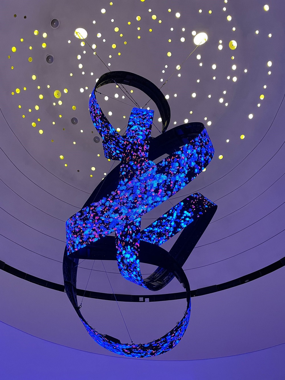 Los trabajos llevados a cabo por ACCIONA Ingeniería Cultural abarcan 5.800m2 de superficie expositiva, dividida en dos áreas expositivas temáticas complementarias. ‘Destellos’, ubicada en la plaza bajo los conos de la planta a pie de calle, está conformada por varias instalaciones que muestran aportaciones españolas a la cultura universal y realzan su relación cultural con el mundo árabe.