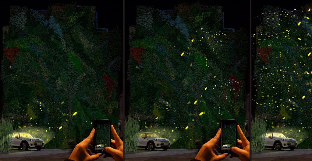 Por la noche, comenzó un espectáculo de partículas lumínicas animadas en el que el jardín vertical que se iluminaba con cambios de intensidad, creando un efecto hipnótico al simular movimientos de insectos que iban viajando por el muro vegetal, como si floreciesen.