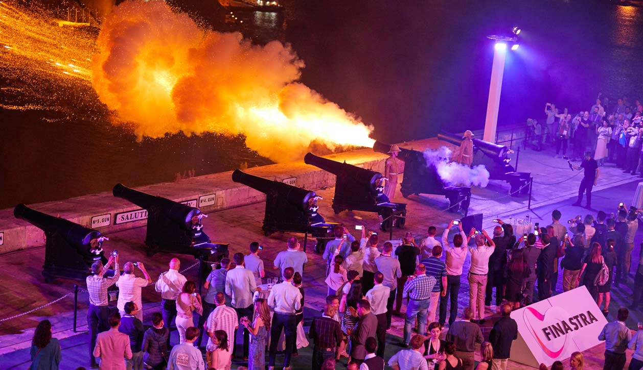 Cenas con esencia de Malta y Mediterráneo. Las sesiones de trabajo desarrolladas en el Hilton Malta tuvieron su contrapunto en las cenas al final del día eligiendo ubicaciones representativas del destino. En este caso la noche dedicada al cóctel de bienvenida se celebró en la centenaria batería de artillería Saluting Battery, al borde del mar y con vistas a las fortificaciones de la ciudad. Se aprovecharon los cañones de la batería defensiva del fuerte para ofrecer un espectáculo de artillería haciendo funcionar los cañones en una batería de salvas. Para ambientar el espacio se aprovechó para iluminar los cañones y jugar con el humo y la proyección de luces iluminando con los colores de Finastra, además de proyectar con láser el logo en los muros de la fortaleza.