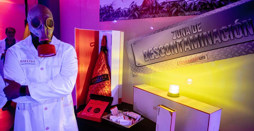 El espacio Uno Nueve fue el venue elegido tanto para la presentación de prensa de la mañana como para la convocatoria de influencers y expertos del sector del mundo gastronómico. Estos últimos, tras la presentación de los resultados más relevantes del estudio, se vieron sorprendidos por una alarma de alerta por riesgo biológico. Tras un apagón y luces ultravioletas parpadeando por la sala, se conecta la pantalla con un parte de informativos en directo que informa de la alerta mundial provocada por el preocupante ascenso de productos ultraprocesados, conservantes y aditivos artificiales presentes en los alimentos. Sólo es posible descontaminarse consumiendo jamón Joselito que es 100% natural.