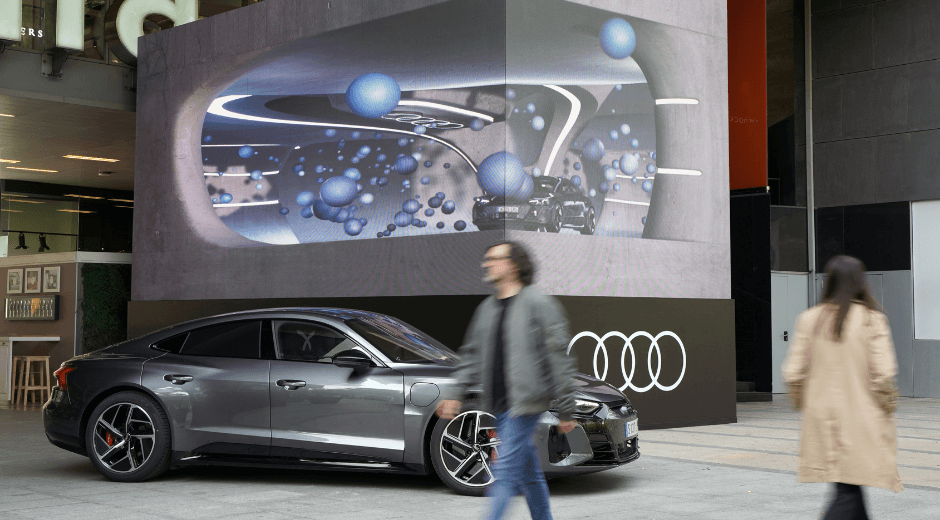 Audi tenía claro que para la presentación de su nuevo vehículo quería una activación que se saliera de la norma, por eso, apostaron por una propuesta disruptiva basada en la utilización de efectos 3D y la inteligencia artificial. Una puesta en escena que no podía llevarse a cabo en cualquier lugar ya que principalmente constaba de una gran estructura formada por pantallas LED de 12 x 4 metros. El centro comercial L’illa ofrecía el espacio necesario y también un espacio cubierto imprescindible para proteger todo el despliegue tecnológico. Esta instalación inmersiva funcionaba gracias a la aplicación de una tecnología basada en el motor de gráficos Unreal Engine y la configuración nDisplay de Epic Games, que permite crear contenidos interactivos en tiempo real.