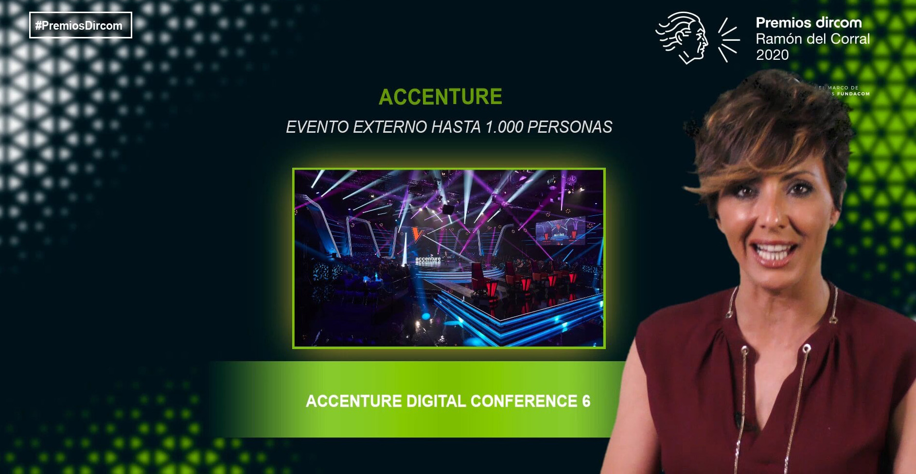 La opción finalmente elegida fue la reconversión total a un programa pregrabado en el estudio de Reportarte, la compañía encargada de la producción audiovisual. “Nuestro estudio dispone de una zona de grabación con fondos intercambiables, decorados, cortinaje, telepronter… Cuenta con las dimensiones y el equipamiento que se necesita en este caso”, nos explica Alberto Goytre de Reportarte. Allí, a ese estudio sí se desplazó la presentadora elegida, Sonsoles Ónega, la cual consideran una figura clave. “Nos felicitan por la elección de la presentadora y es cierto que supo darle gracia y dinamismo a un relato que puede ser un poco complicado a la hora de escuchar desde el ordenador o el dispositivo móvil, 69 empresas finalistas, 23 categorías diferentes de premiados…”, admitía Paz. Además, nos cuentan que la emisión en YouTube Live permitía un chat público “y con cada premiado se llenaba de felicitaciones en directo”. (En la fotografía a continuación el momento donde se revela Accenture Digital Conference 6 como mejor evento externo de hasta 1.000 personas).