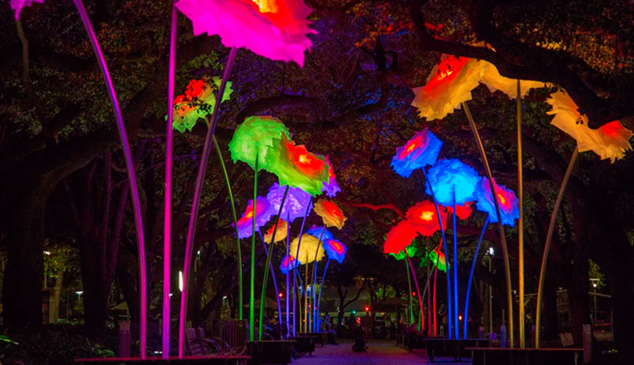 Naturaleza y geometría en el Jardín Botánico. Luciendo entrada decorada para la ocasión por ramos gigantes de peonias de papel -que iluminadas desde sus maceteros tomaban una colorida paleta de reflejos y matices- el interior de este vergel urbano albergó proyecciones de luz de formas geométricas realizadas directamente sobre la vegetación y el paisaje del jardín.