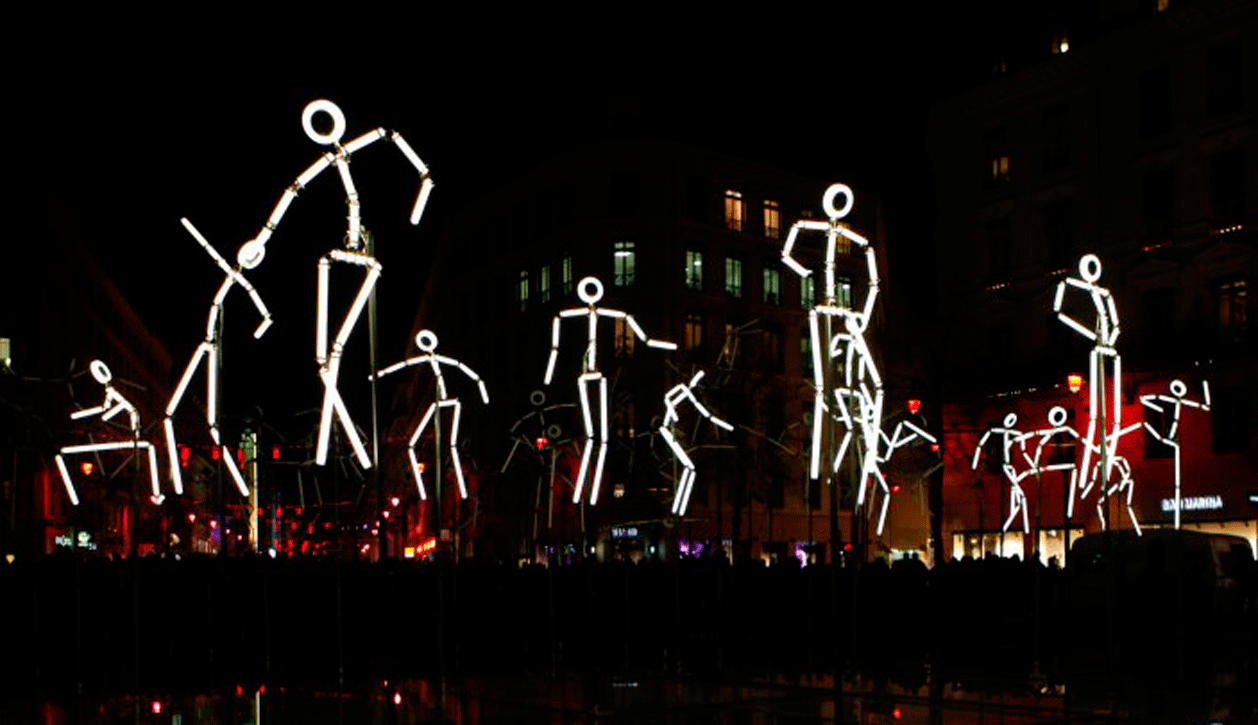Keyframes. O cómo una escultura colectiva a base de figuras realizadas con tubos de luz semejando fluorescentes pueden contar una historia. Estos personajes de luz, colocados en posiciones concretas recrearon historias, situaciones y bailes mediante secuencias de iluminación programadas.
