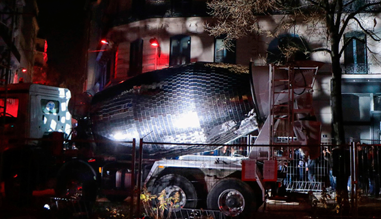 Una hormigonera se transforma en bola de discoteca. Delante del edificio que alberga el Salón de Reinos, antiguo salón de recepciones y fiestas de Felipe IV, se llevó también una fiesta actual e inusual a través del descubrimiento de una hormiguera. Mediante la performance, la hormigonera se transformó en una bola de discoteca convirtiéndose en el centro de una fiesta, de un gran salón de baile al aire libre.