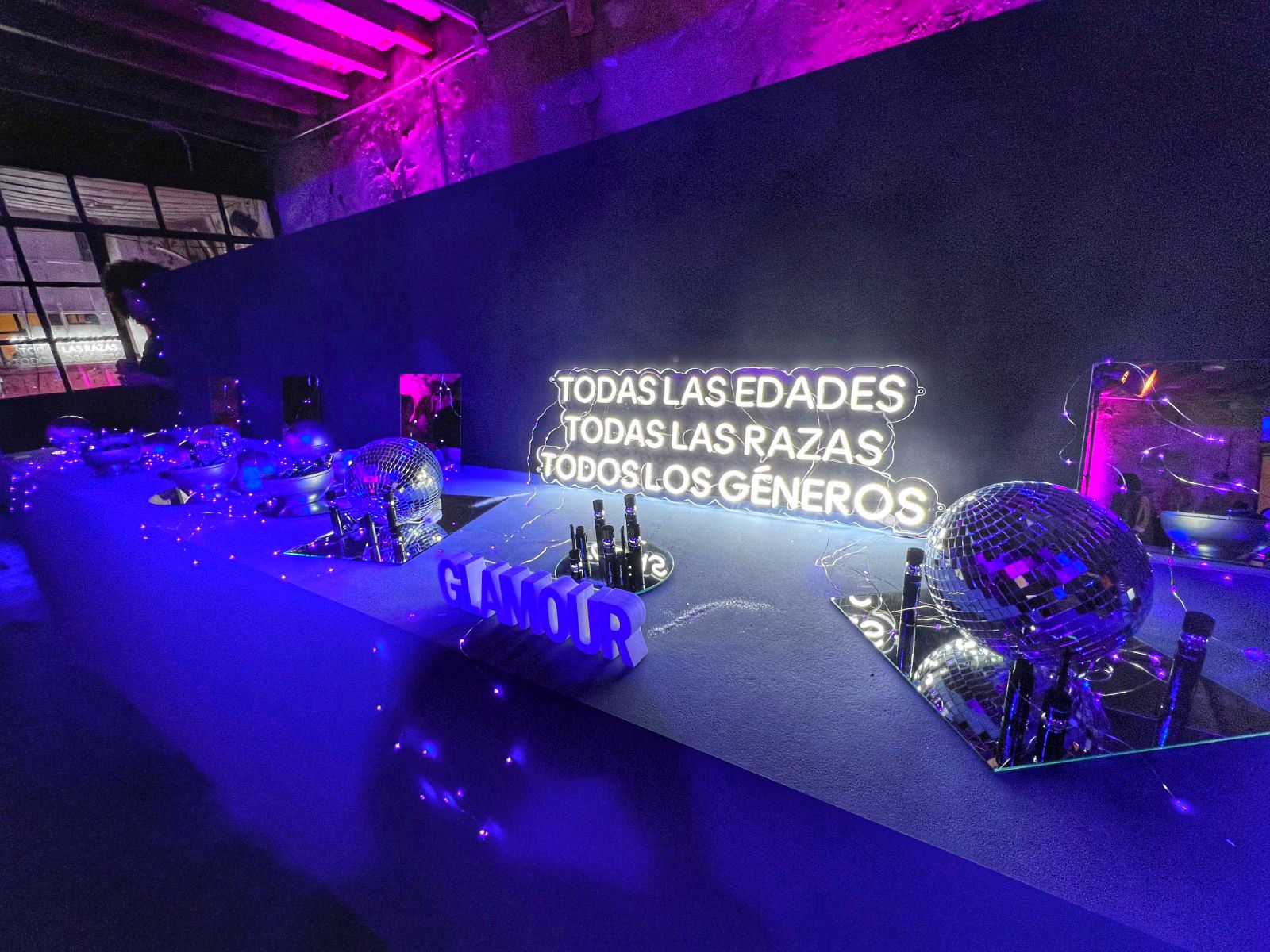 Esta máscara, que se ha hecho viral por su efecto, merecía un evento con una imagen igual de impactante. Con una decoración inspirada en la estética disco, se colocaron varias muestras del producto junto a un contundente mensaje escrito con luces de neón: “todas las edades, todas las razas, todos los géneros”.