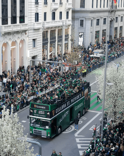 Lo folclórico sigue mandando… y es que el desfile de San Patricio en Gran Vía, núcleo de la celebración, ha superado las previsiones de 1.300 asistentes. La multitud estaba ahí para ver a los 700 gaiteros, coordinados por Bras Rodrigo, a la Banda de Gaitas Ramalleira, formada por músicos gallegos y el autobús de la marca Guinness. Además, el desfile contaba con un espacio VIP para disfrutar del ambiente desde una perspectiva diferente y con ambientación irlandesa. Ver este despliegue de gente en las calles, curiosa e interesada por descubrir y experimentar otras culturas nos habla de la fuerza que tienen los eventos. Y esto no es solo una “sensación”, se puede trasladar a datos: en todo el mundo se consumen 13.000.000 de pintas Guinness, este fin de semana solo en España se han servido 1.200.000.