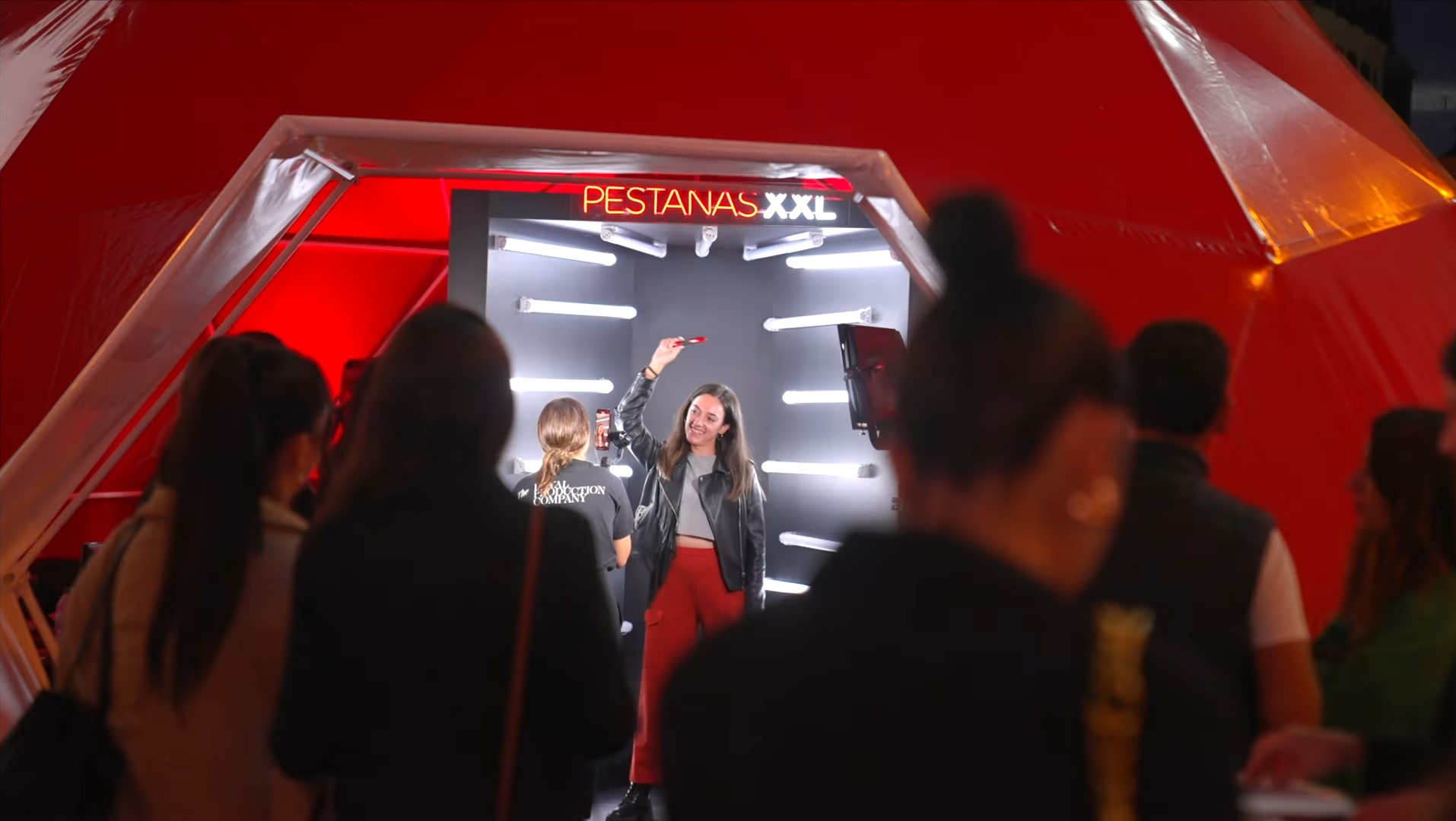 Influencers y anónimos eran maquillados con L’Oréal Paris PRO XXL Lift en una carpa de color transparente y posteriormente posaban en otra, concretamente en un set de fondo negro iluminado por varios fluorescentes de colores.