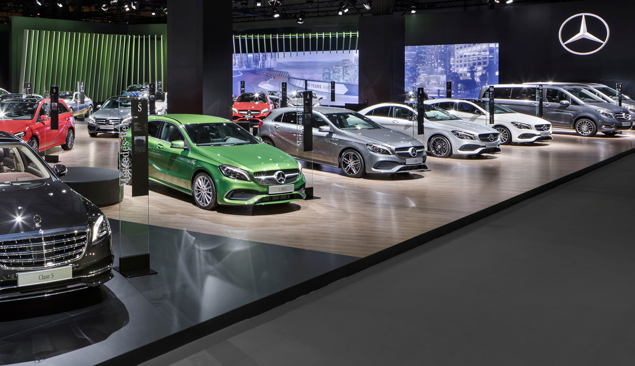 El stand viene de Alemania, para asegurar una consistencia perfecta en las diversas presencias de la marca. Destaca la iluminación: muy cuidada, llama la atención porque es mucho menos viva que en el resto de stands, casi tenue, pone los focos iluminando con precisión los vehículos, poniendo en valor su protagonismo. Reducir la polución visual y atraer la atención del asistente sobre el producto… que siempre es perfecto porque varios profesionales de la limpieza pulen de forma constante la sagrada carrocería de los Mercedes. Coherentemente con el reposicionamiento de la marca, los modelos que más destacan son los deportivos, con colores vivos, dando una imagen de dinamismo que evoca mucho más al Mercedes de la Fashion Week de Madrid, que al coche de tu abuelo.