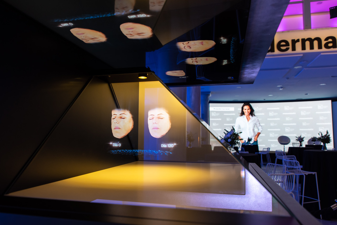 Paraddax instauró un holograma que mostraba 3 casos de “antes-después” del tratamiento dermamelan y presentaba del producto de una manera innovadora y tecnológica, valores que, según nos cuentan, son pilares de mesoestetic y del tratamiento en específico. Todo un ejemplo de cómo la tecnología consigue transmitir los mensajes.