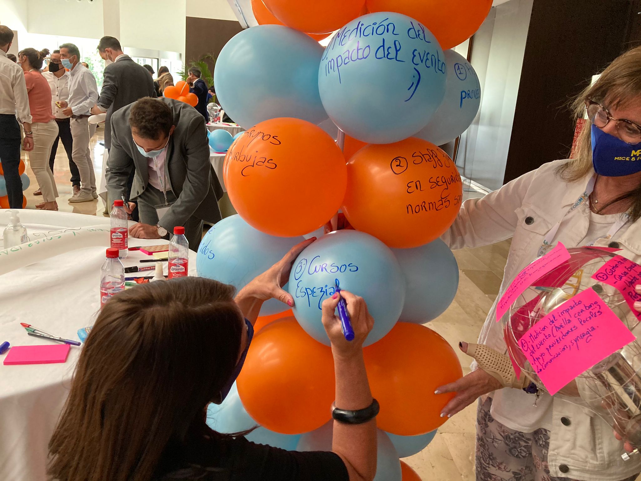 Con todas las medidas de seguridad e higiénico-sanitarias de por medio, y divididos en equipos, y ayudados por David Serrano, coach y CEO de la productora, y varios facilitadores, “entre todos aportamos nuestras opiniones e inquietudes, así como las soluciones, ideas y nuevas oportunidades que el nuevo mapa del sector nos había dejado tras la pandemia”, nos señalan desde Es.Cultura Eventos. Luego se discutieron y apuntaron en los globos que, como colofón, formaron una cadena ADN MICE de más de 15 metros.