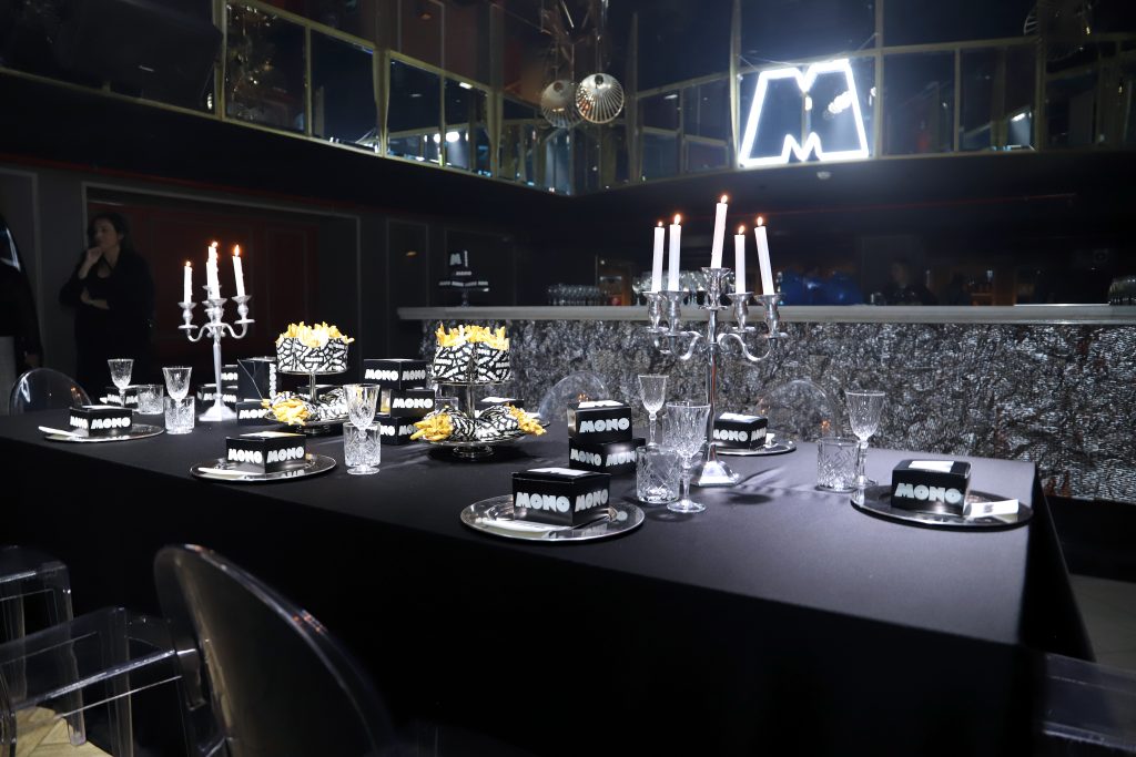En la ‘planta inferior’: se instaló un escenario de dos metros de altura, cubierto por cortinas de ante negro, una mesa de Dj con la forma de la caja de la hamburguesa abierta y la mesa imperial decorada con un mantel de seda negra y menaje plateado. Además, se instaló una barra de bar cubierta con el papel plata que cubre sus hamburguesas y un neón con la M de MONO.