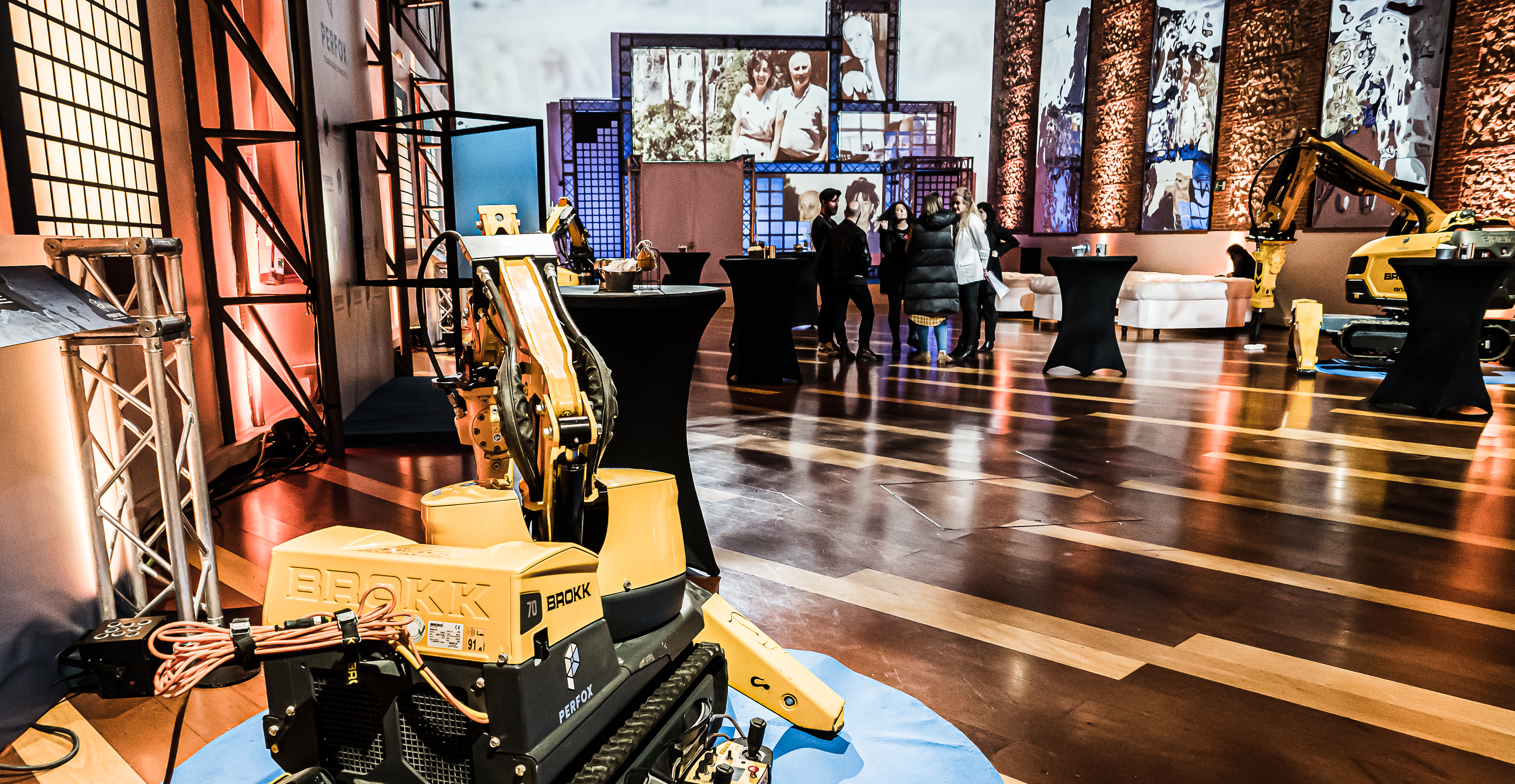 El “decoproject”, así lo llaman desde Planta 18, partió de los 6 hitos considerados por la empresa como los más importantes a lo largo de sus 45 años. Nos revelan que con estos como base, se configuró la decoración, los colores y toda la escenografía. En la distribución del espacio y entre las mesas de catering se dispusieron las máquinas con las que la empresa lleva a cabo sus trabajos, una muestra in situ de lo que emplean día a día y de lo que son. Un trust (de nuevo un guiño industrial) sujetaba varias gráficas y pantallas, en las que se proyectaba un video mapping que de nuevo repasaba la historia “demoledora” de la empresa.