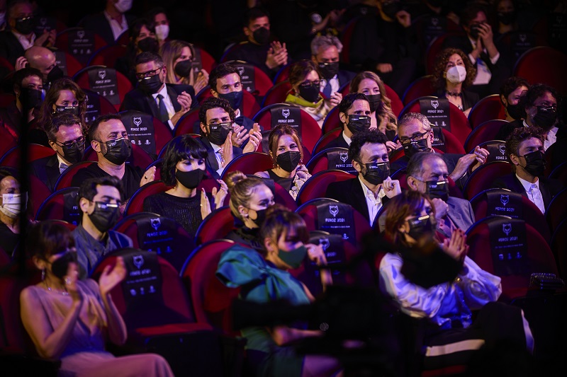 Nosotros queríamos el evento presencial porque venimos del mundo presencial, de eventos culturales, festivales, etc. que algunos de ellos han tratado de sobrevivir en tiempos covid, y los que hemos conseguido sacar adelante han sido un éxito sin excepción, y entendíamos que los Feroz, cumpliendo todas las normas de seguridad, podría ser un evento presencial como otros. Pero eso no habría sido bastante si no fuera porque la junta directiva de la asociación (que ya no pertenecemos a ella) también lo vio muy claro. Ellos se afirmaron en la importancia de la presencialidad, ya que la naturaleza de los Feroz, y en general de todos los premios, está muy vinculada a la dinámica del encuentro entre industria y prensa, que es una parte consustancial de nuestra organización. Y luego un tercer factor que no voy a ocultar, fue el tema de la financiación. Para unos premios institucionalizados como pueden ser los Goya o los Oscars la financiación está garantizada. Pero los Feroz, aunque cada vez están más consolidados de cara al público, todavía trabajan en la consolidación de su estructura, de su viabilidad financiera, y esta es un poco su debilidad. En esta edición no habría sido posible financiar la gala si no era con un evento presencial con su photocall en el que nuestros patrocinadores tuvieran su oportunidad de estar con las estrellas de cine y las series, aunque fuera con mascarilla.