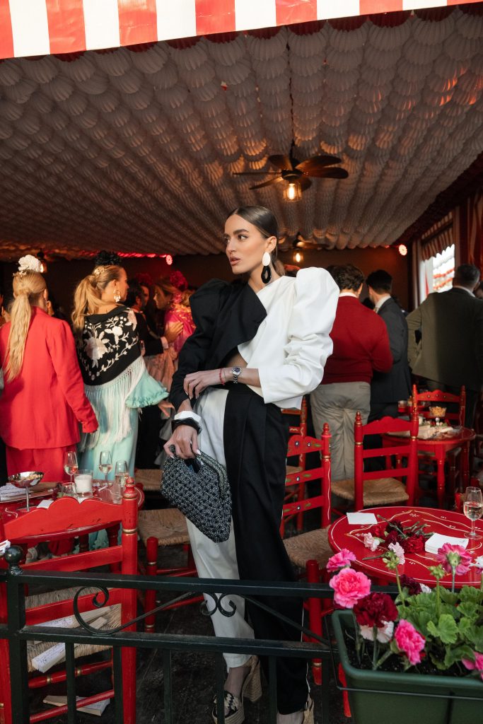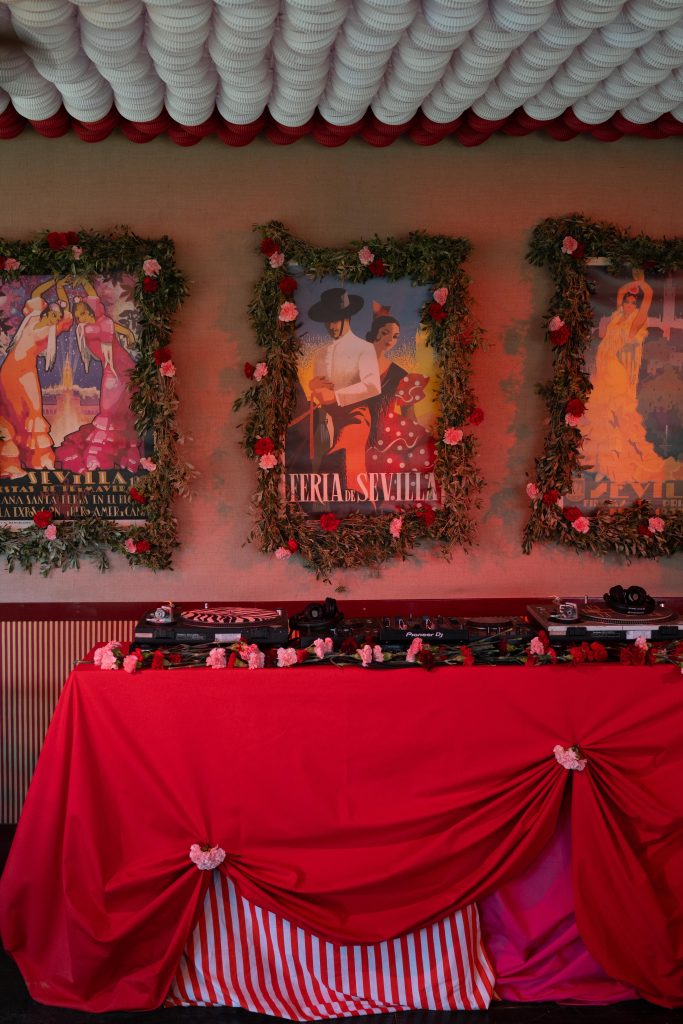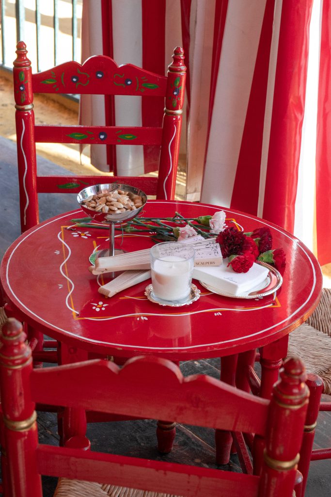 La decoración se presentaba como un auténtico ejercicio de sutileza. Un take-over completo de la caseta, pero sin estridencias: pétalos, claveles, luces y detalles, que hablaban el mismo lenguaje que la Feria sin disfrazarse de ella. Según nos comenta la directora del proyecto, Ligia Solís, la dirección artística encontró inspiración en referencias como la campaña de Dolce & Gabbana primavera-verano 2012, donde la mesa se eleva a objeto de deseo. Aquí, ese simbolismo se adaptó al folclore andaluz para crear una puesta en escena que conecta con la idea principal. Además, se sumaron detalles como servilletas con el nombre de la marca escrito a mano por el diseñador Jorge Parra, que también creó los dibujos del abanico que pudieron llevarse los asistentes de recuerdo.
