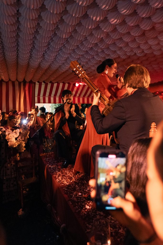 La segunda parte de la noche transformó esa misma mesa en escenario. Entre artistas flamencos y un DJ que ofreció una sesión con sonidos fusión de flamenco y tecno, la caseta se modernizó sin perder el espíritu auténtico que le brindaban el escenario “improvisado” y los sonidos más ancestrales. De esta manera, la animación seguía el hilo de la temática y permitía no desentonar en las circunstancias de la cita aportando toques modernos.