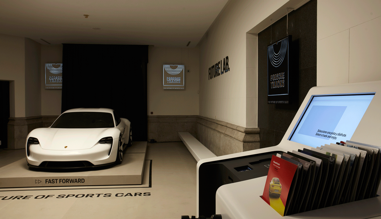 Abierto al público, gratuito y durante dos semanas en plenas fiestas navideñas, la marca eligió el Palacete Carlos Mª de Castro en el señorial barrio de Almagro para montar un espacio de marca de 400m2 en el que el público podía conocer la historia y futuro de Porsche, sus modelos legendarios y el futuro hacia la movilidad eléctrica que representa el futuro modelo Mission E. Y es precisamente el plato fuerte del pop-up, el Porsche Mission E, el elemento que articulaba el recorrido y las distintas estancias de ‘Porsche Tracks’. Así el modelo presidía el paso de carruajes del edificio, convertido en una sala interactiva, donde el público podía conocer el nuevo modelo a través de la realidad virtual y dispositivos móviles. De ahí se podía pasar a distintas salas donde sentarse en cómodos sillones y disfrutar de los cuadros del artista Manu Campa con lienzos de distintos modelos de Porsche; un bibliobar o un rincón del diseño en el que las paredes convertidas en pizarra invitaban a diseñar el modelo 911 de la marca.