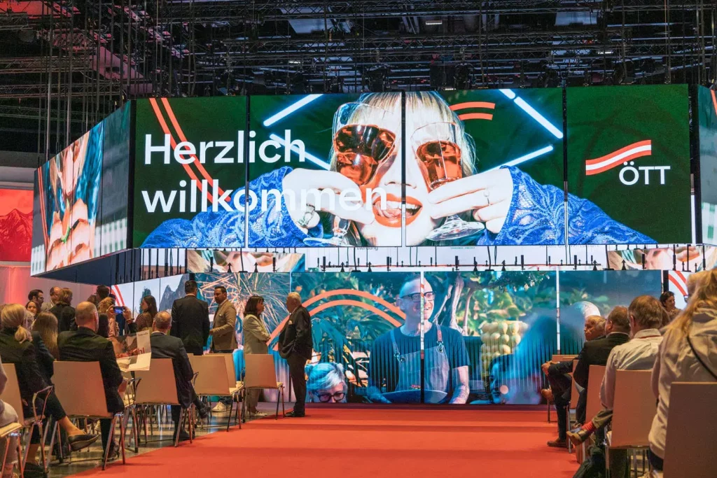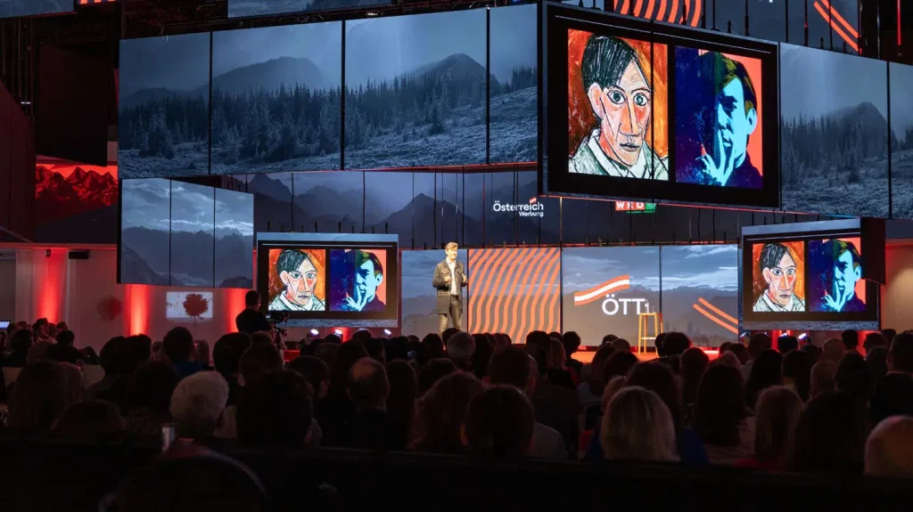 Crearon una pantalla cinética envolvente con 52 pantallas led móviles de 108 millones de píxeles como escenario que transformó el vestíbulo de entrada del recinto en siete escenarios diferentes en segundos, un espacio que se utilizaba por primera vez como escenario principal para un simposio. Una coanfitriona creada con IA servía de eje del evento: los participantes podían hablar con ella, les guiaba por el evento y sus contenidos, era experta en los detalles y analizaba sus respuestas. Basada en un GPT personalizado, fue entrenada con datos específicos sobre tendencias futuras, tecnologías y desafíos en el turismo austriaco.