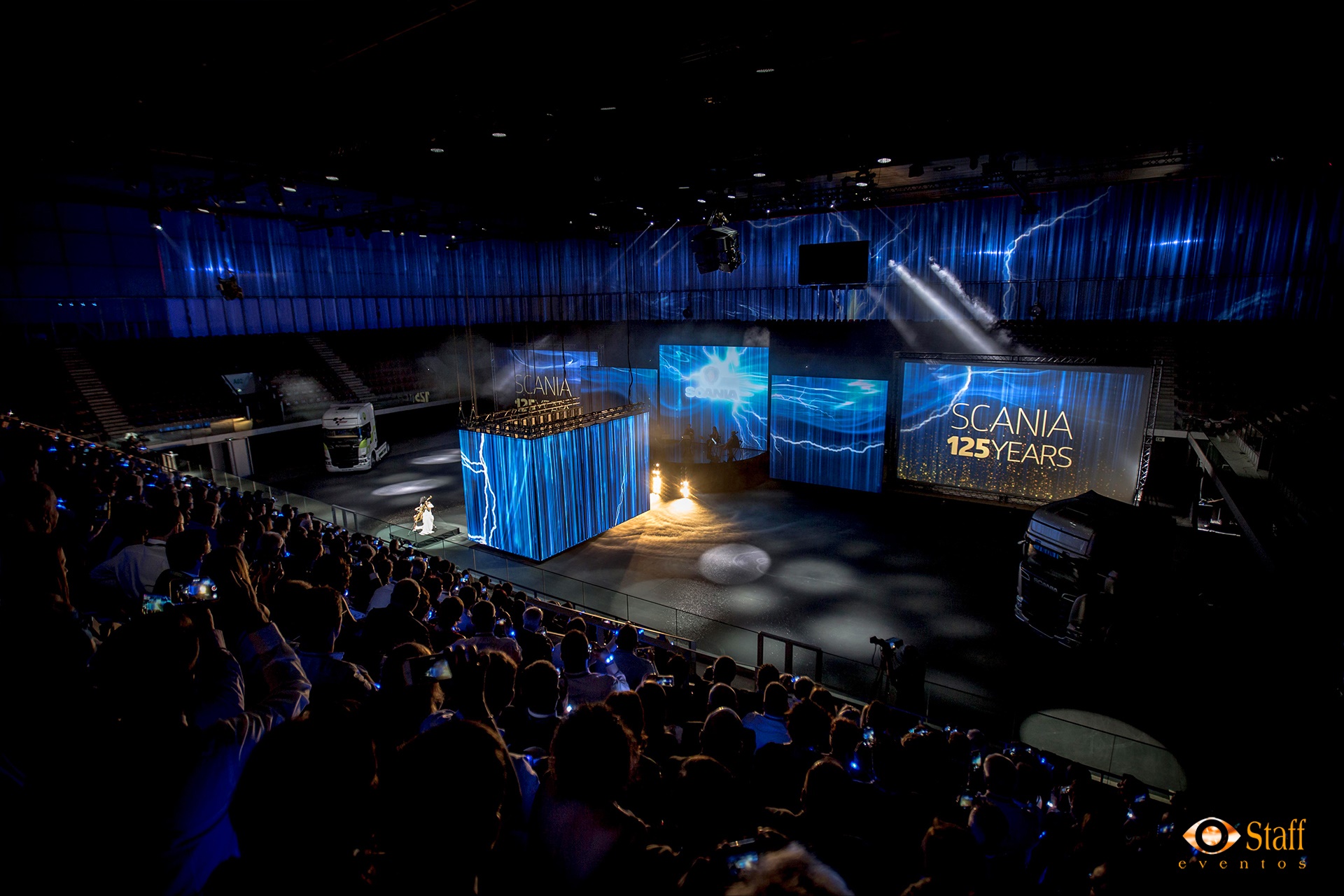 Para el momento reveal, se dio a todos los invitados unas pulseras de led interactivas que serían manejadas por control remoto formando parte del espectáculo. Un mapping con contenidos envolventes sobre la escenografía a 270⁰, contaba los 125 años de historia de la compañía antes de dar paso al momento espectacular de la noche: la presentación de la cabina del nuevo modelo de Scania. Esta apareció suspendida del techo –a 41 metros de altura- y envuelta en una caja de pantallas led de 24×6 metros. Un total de 9 toneladas de la cabeza tractora más 2 toneladas de la caja de leds.