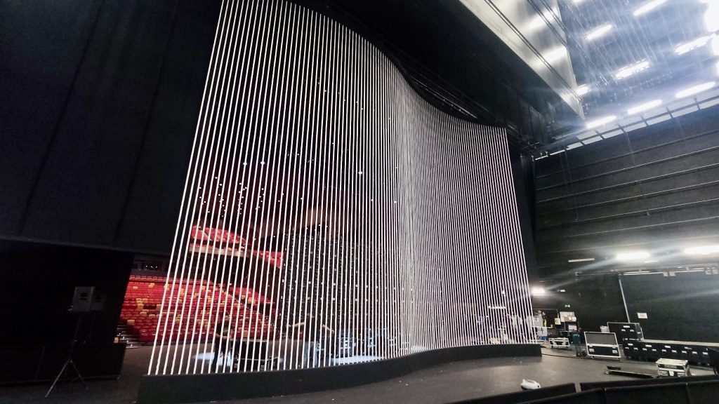 Para iluminar el mural formado por cuerdas y crear un efecto dinámico, se utilizaron 16 barras con un total de 384 led rgbw situados en la base de la estructura. De esta manera las maromas podían teñirse de distintos colores, ofreciendo distintas escenografías con un mismo decorado. El espacio se coronaba con una pantalla LED colgada desde el peine del teatro, utilizando cables de acero negros que gracias a los juegos de luz se convertirían en invisibles al ojo humano.