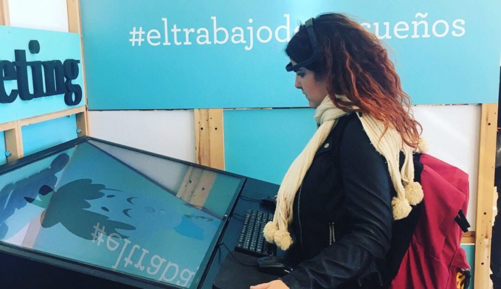 …y llega el estudio personalizado de neuromarketing. Que al llegar a la universidad los estudiantes vieran un stand con una pantalla y personas con sensores en la cabeza es sin duda una buena forma de captar la atención. Y claro, muchos curiosos se acercaban a ver qué era eso del neuromarketing -la novedad y la tecnología es un buen reclamos para este tipo de público-. Para poder participar únicamente debían rellenar en las tablet disponibles un formulario con sus datos y aceptación de LOPD a través del sistema firma digital, la bases legales se enviaban en el momento al correo electrónico facilitado. Ya en el stand, los dinamizadores les colocaban dos sensores, uno acoplado en la frente y el otro en el lóbulo de la oreja izquierda para captar los estímulos que recibe el cerebro ante una serie de imágenes y videos emitidos en una pantalla: cinco preguntas y tres vídeos sirvieron para medir los niveles de emoción, de atención y las reacciones del cerebro que se tradujeron en resultados porcentuales para trazar el `perfil profesional´ del estudiante. Esos datos se recogían en un informe que se podían descargar de inmediato y compartirlo en las redes.