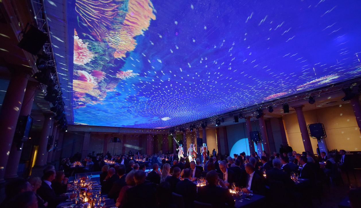 Para la gala de la noche, los invitados pasaron del entorno convencional de las conferencias a un entorno inspirador y cautivador. El escenario se convirtió en un enorme océano lleno de criaturas marinas rodeando toda la sala, lo que permitió al público visualizar y experimentar el concepto del evento. Un entorno oceánico que lograron colocando una pieza de tul transparente de 250m² sobre las cabezas de los invitados que actuó como superficie de proyección gigante. Con la ayuda de proyectores de espejo, reprodujeron un video animado que transformó la habitación en un paisaje impresionante por encima y por debajo del agua. Allí sumergieron a los invitados que experimentaron esta inmersión varias perspectivas que, dependiendo del contenido y de la iluminación, pasaba de ser una superficie opaca a ser transparente, revelando la “Room for more» oculta detrás del océano.