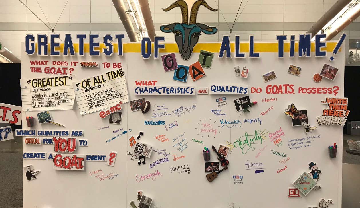 In various places of the convention center, especially in the tech area, big boards for people to contribute their ideas are displayed, adding to an atmosphere which suggests all participants can contribute. And an easy way to get some fresh ideas. Oh, and by the way, GOAT means (how can your event be the…) greatest of all times!