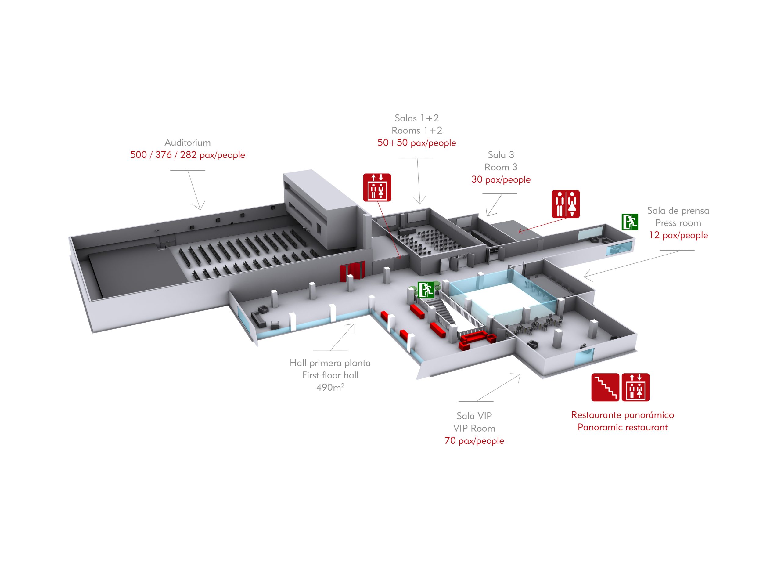Acotado para 200pax, en formato pupitres, en formato original con 376 butacas o en ampliado para 500 personas.