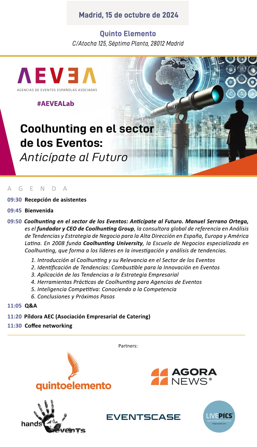 AEVEALab es un espacio de formación, donde se dan charlas para los profesionales de eventos. Esta ponencia: «Coolhunting en el sector de los Eventos: Anticípate al Futuro», la dará Manuel Serrano Ortega, fundador y CEO de Coolhunting Group, la consultora global de referencia en Análisis de Tendencias y Estrategia de Negocio para la Alta Dirección en España, Europa y América Latina.