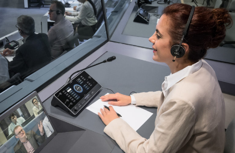 -Prepara la cabina de intérpretes: Configura los pupitres de intérprete con los canales correspondientes y hazles llegar el audio de sala. Los intérpretes deben tener acceso claro al escenario y a los ponentes siempre que sea posible.