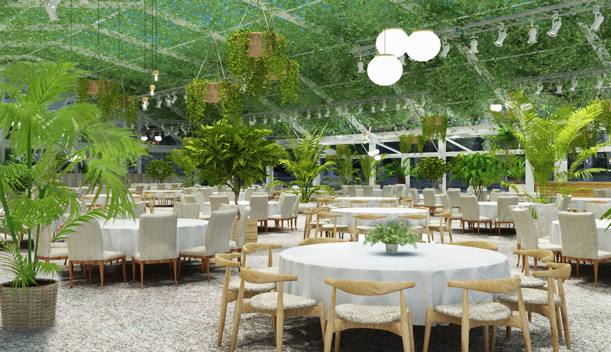 Se trata de un pabellón de 1.350m2 diáfanos ambientados en un invernadero con capacidad para 2.500 personas en formato coctel, 1.100 en banquete o 1.350 en teatro. El espacio, cerrado y cubierto, es temporal y estará abierto los meses de noviembre a marzo. Su estructura es transparente y tiene una altura de más de cinco metros por lo que la sensación de tus asistentes será la de estar al aire libre, sensación a la que ayuda el estar en un entorno con encanto y rodeado de plantas.