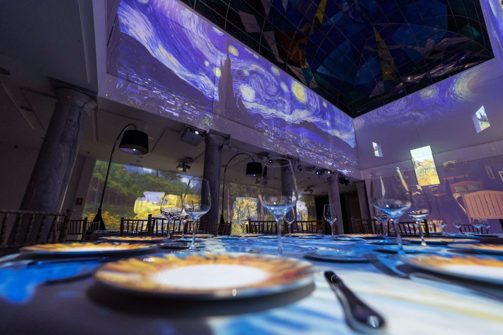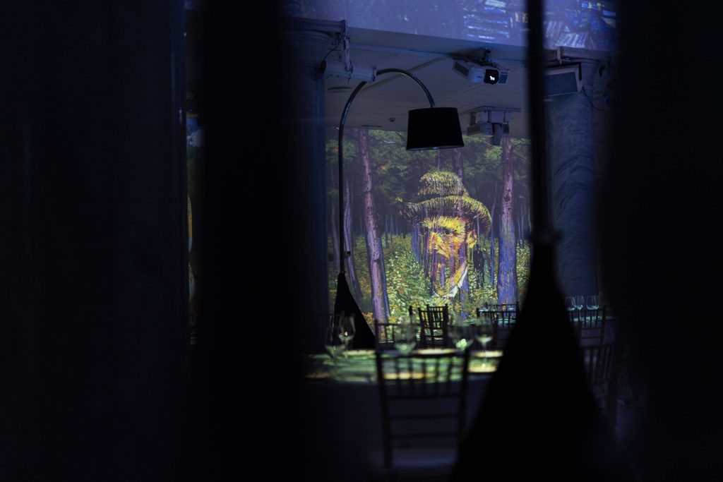 Durante la velada (disponible desde 50 hasta 500 personas y que puede personalizarse con los logos, colores e imágenes de la marca) los invitados pueden disfrutar de hasta cuatro ambientes artísticos diferentes proyectados sobre paredes y mesas, cada uno con una selección de platos que reflejan la esencia de cada artista.