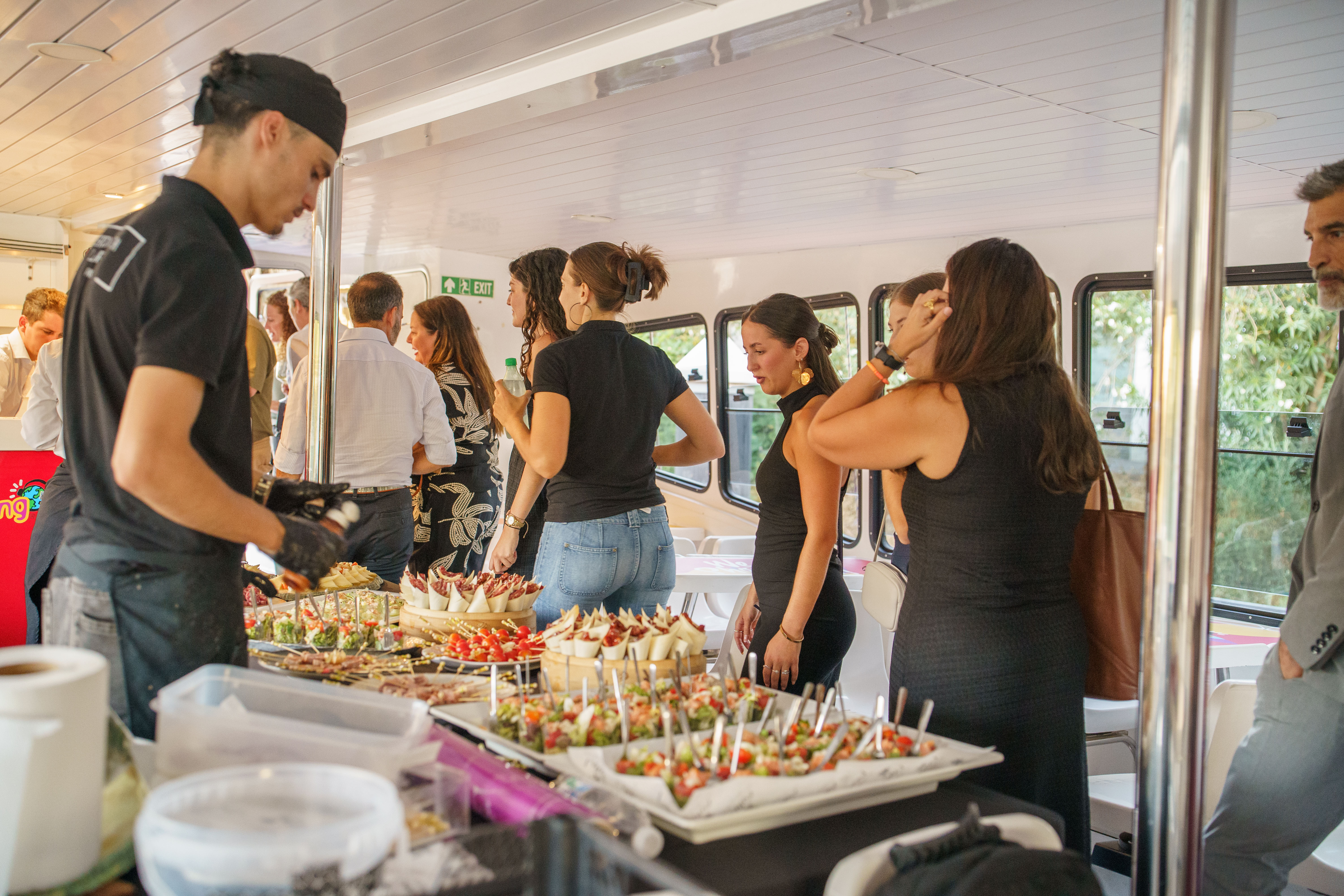 El barco incluye una barra de bar por planta, sonido envolvente en todo el barco con micrófonos fijos e inalámbricos, dos baños en la planta baja, espacio para reuniones de 15 personas, posibilidad de actuaciones dentro del mismo, opción de catering bajo petición.