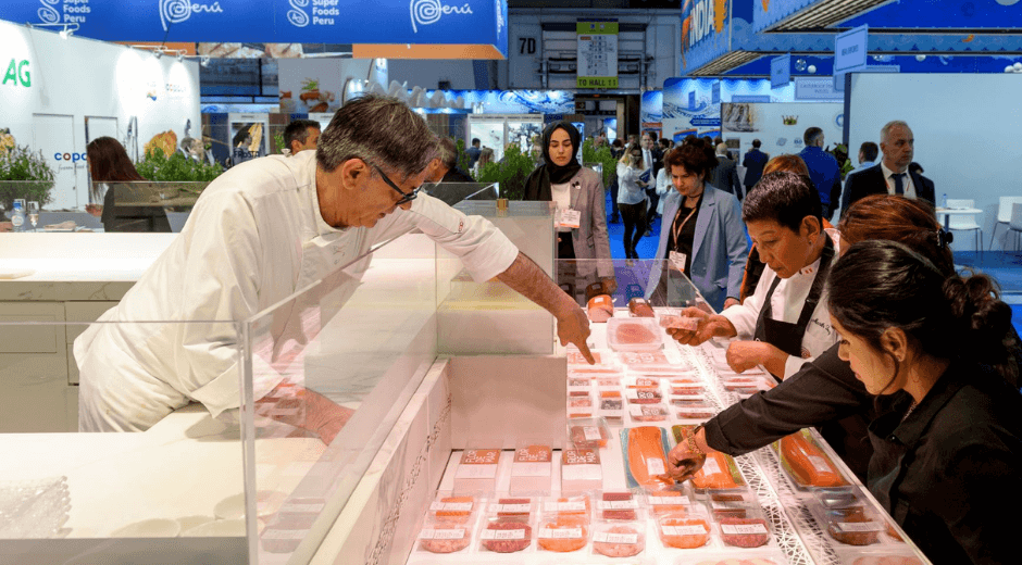 También hay un componente experiencial: se lleva una gran cantidad de productos del mar al evento. Al ser un evento gastronómico, las personas necesitan ver y probar el producto. Así que la gente construye restaurantes en la zona de exhibición. El pabellón noruego construye un restaurante, por ejemplo, y hay mucho entretenimiento.