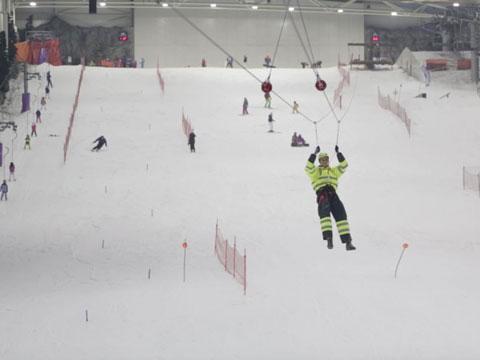 Para volar a casi 10 metros sobre la pista de nieve solo es necesario estar entre los 40 y los 100 kilos de peso y tener ganas de emociones fuertes. Al punto de salida de la tirolina se llega por telesilla que nos remonta al punto más alto de la pista. Para no pasar frio, los asistentes cuentan con peto, buzo y caso para solo preocuparse en disfrutar de la bajada.