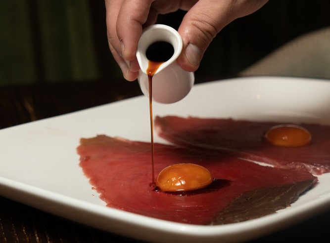 Gastronomía mediterránea y especialmente española. El espacio ofrece cocina mediterránea y especialmente española: platos terminados delante del cliente hacen que la experiencia sea más intensa, como el escalope de solomillo empanado de corte grueso para conservar el crujiente por fuera y la jugosidad interior y es acabado con un huevo a baja temperatura y salsa perigord con champiñón y trufa negra, o las flores de calabacín fritas en tempura rellenas de tartar de gamba blanca o los buñuelos de carne guisada y salsa brava con un resultado de una fritura en su punto óptimo.