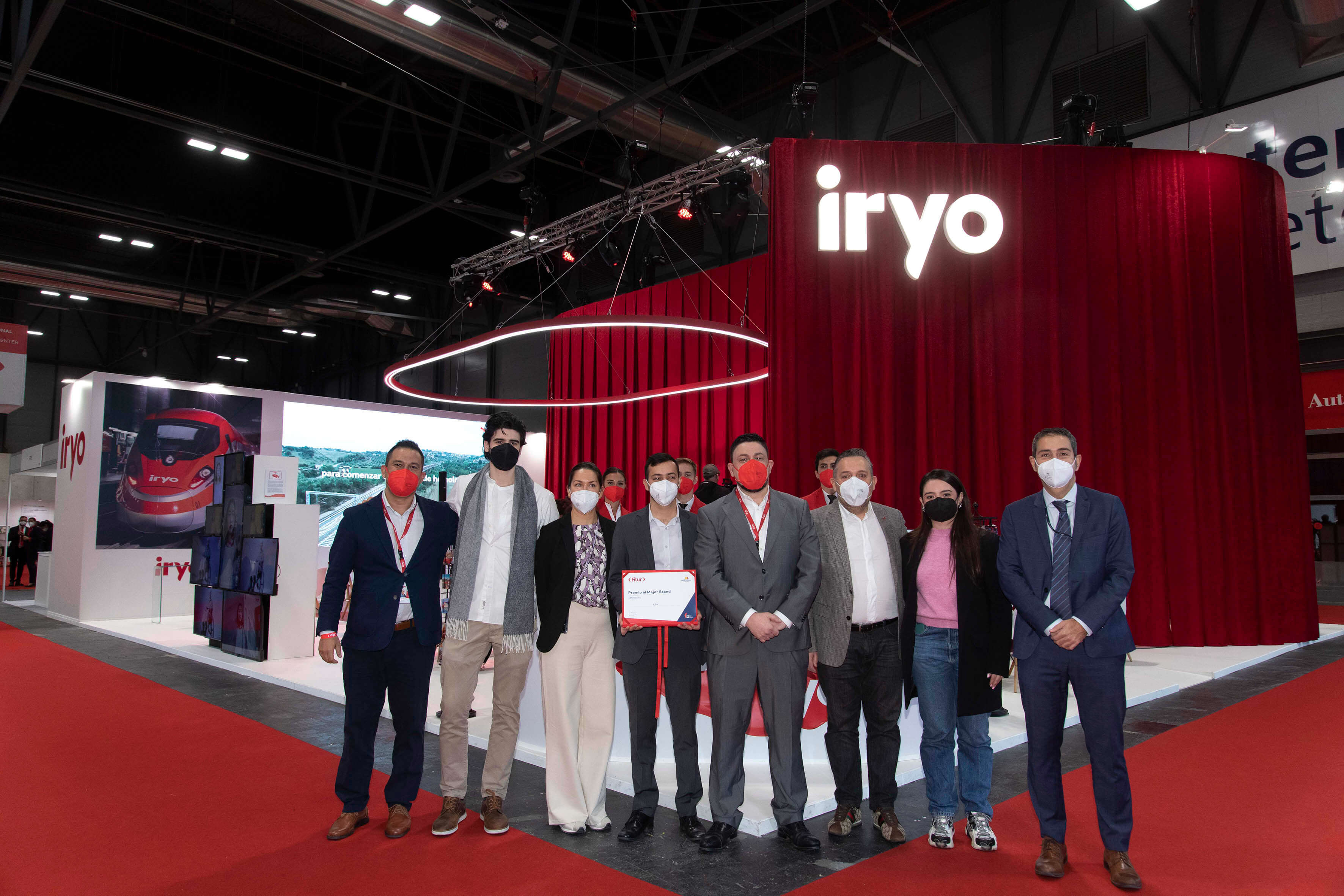 «Iryo, llega de la mano de un gran foulard rojo que vuela con el viento para posarse en los distintos destinos que la empresa ofrece. El contraste absoluto de la marca y una elipse de luz blanca sobre el fondo de terciopelo rojo es innegable. Obliga al visitante a voltear la mirada y descubrir la nueva velocidad».