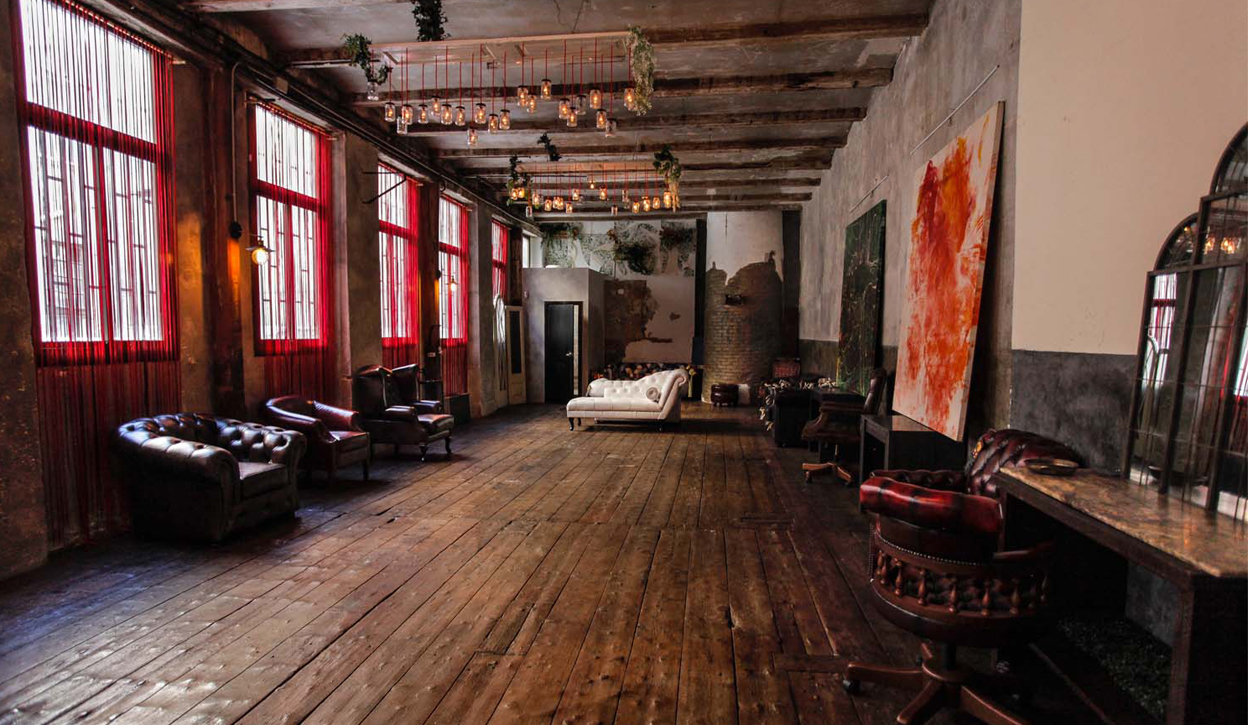 Espacio industrial de 150m2 estilo neoyorquino con entrada de luz natural gracias a siete ventanales de 2m x 1m cada uno. En el espacio existe un suelo rústico de madera antigua, una pared con chimenea antigua de ladrillo y elementos de decoración de estilo vintage.