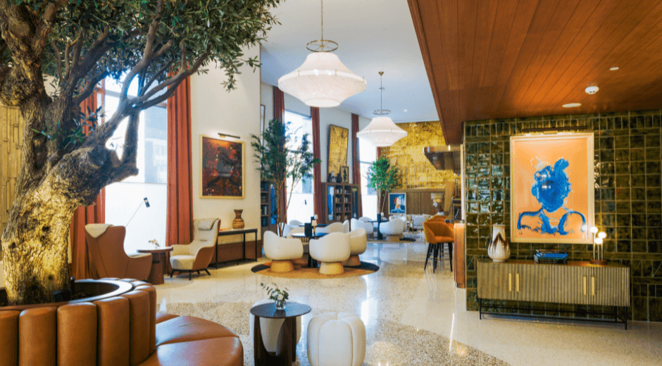 Para la decoración interior, se ha contado con el estudio de Lázaro Rosa-Violán, que se ha inspirado en el legado cultural de la ciudad y ha incorporado elementos propios del cubismo. Dentro también predomina una composición cromática con colores neutros como el blanco y los colores tierra, que se combinan con tonalidades propias del mediterráneo como el azul, el verde y el color cobre. En el lobby destaca un gran mural realizado artesanalmente con piezas alicatadas de cerámica y, en el hall, un imponente olivo rodeado por un banco serpenteante.