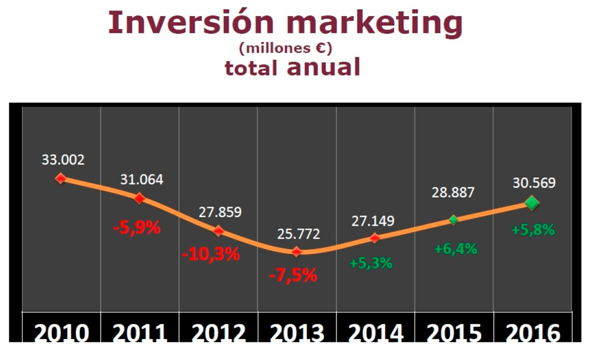 Este informe, el primero que cuantifica el impacto económico del marketing en un país concreto, revela que en 2016 la inversión creció un 5,8% más que el año anterior hasta alcanzar exactamente los 30.569 millones de euros. Aunque sigamos sin alcanzar los datos de alcanzados en 2010 y 2011, el estudio concluye que la evolución de esta industria estuvo por encima del incremento del PIB nacional que se situó en el 3,3%.