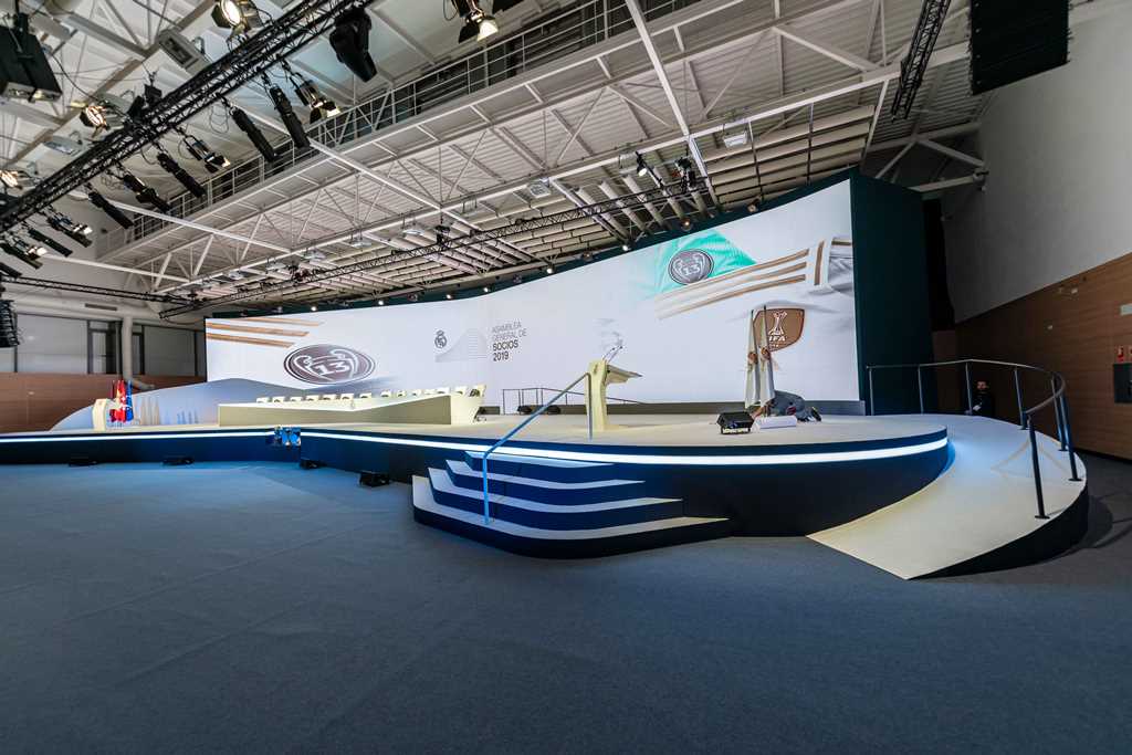Mejor decoración de una asamblea o junta de accionistas. Emporia Oro para Real Madrid-Asamblea General Ordinaria De Socios, de EDT Eventos. Para la Asamblea General Ordinaria del Real Madrid 2019, la agencia puso el foco en la renovación de su emblemático estadio, el Santiago Bernabéu. Inspirados por su arquitectura, dotaron a todo el evento de ese espíritu innovador a través de sus formas, y aportaron un momento wow con una exposición anexa cuyo protagonista fue el templo del Real Madrid.