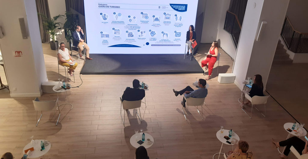 Estos materiales fueron la base de una acción de acompañamiento y asesoría a las empresas asociadas al convention bureau para que implementaran las recomendaciones de la manera más efectiva posible. Por ejemplo, para comunicarlo de una manera más experiencial y tangible, el Madrid Convention Bureau (MCB) organizó el pasado 29 de junio un evento híbrido, en colaboración con SITE Spain, para que sus empresas asociadas conocieran cómo funciona un evento de esta tipología. La nueva normalidad de los eventos híbridos por los que está pasando el sector se puso en escena en el Espacio Villanueva con 25 asistentes presenciales -además de los participantes online- quienes vieron en la práctica las recomendaciones ICTE de separación de mesas, uso de mascarilla, desayuno en mesa personalizado, gel, marcas de tráfico, control de temperatura, regalo en bolsa personalizada de gel y mascarillas etc.