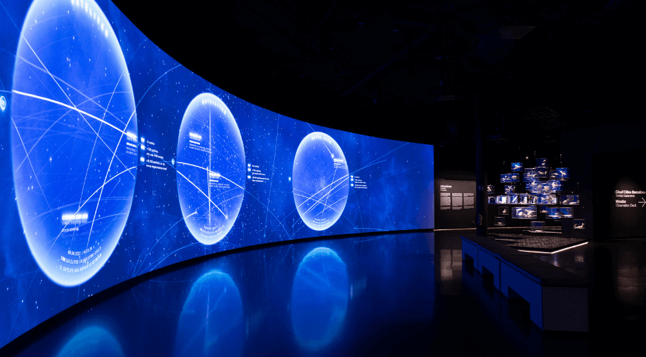 - Hipermirador Barcelona: El viaje se inicia en el edificio externo a Torre Glòries, bajando a la planta -1 donde se encuentra una exposición que invita a los visitantes a observar la ciudad más allá de la que se ve a simple vista. Lo hacen a través de cuatro instalaciones, que combinan arte, tecnología, divulgación científica y audiovisuales en gran formato. La particularidad de esta experiencia es que tiene la voluntad de presentar Barcelona como un organismo vivo (que está en constante cambio y transformación), por eso, los contenidos de la exposición cambian diariamente adaptándose en tiempo real a la realidad del momento (a través de Big data y AI). Los diferentes elementos artísticos (132 figuras de papel creadas por el artista Joan Sallas) y tecnológicos (una gran pantalla en formato de 108m2; una pantalla holográfica con voz producida mediante IA) se acompañan de una banda sonora creada ad hoc para el proyecto. Una propuesta musical (interpretada y musicada por Maria Arnal y John Talabot) que muta día a día en función de la velocidad del viento, la meteorología, las fases lunares, la temperatura del mar, etc.
