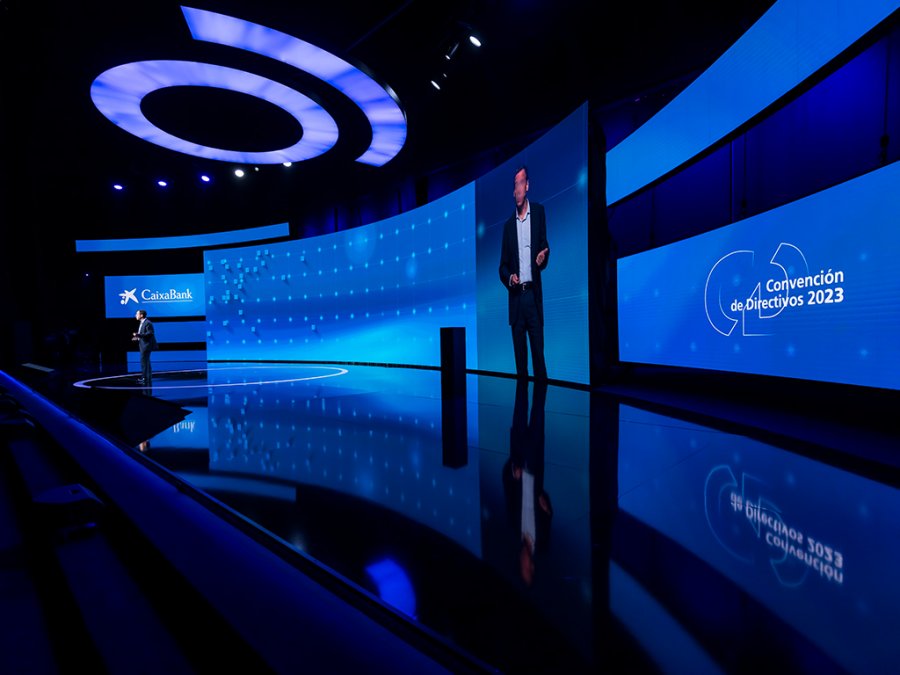 En los últimos años la convención de directivos, la principal cita interna de la entidad bancaria, había dejado de tratarse como una típica jornada de trabajo para abordarse desde un punto de vista más dinámico. Sin embargo, este año fueron más allá para enfocarlo con unos tiempos, formatos, discurso y guionización totalmente televisivos y se creó un escenario en constante transformación para cada bloque, más de 700 módulos led de pantalla, realización de 9 cámaras, etc. Todo ello gestionado, diseñado y producido de una manera coherente para vertebrar no sólo el auditorio sino el resto de elementos y espacios que abarcaba la convención.