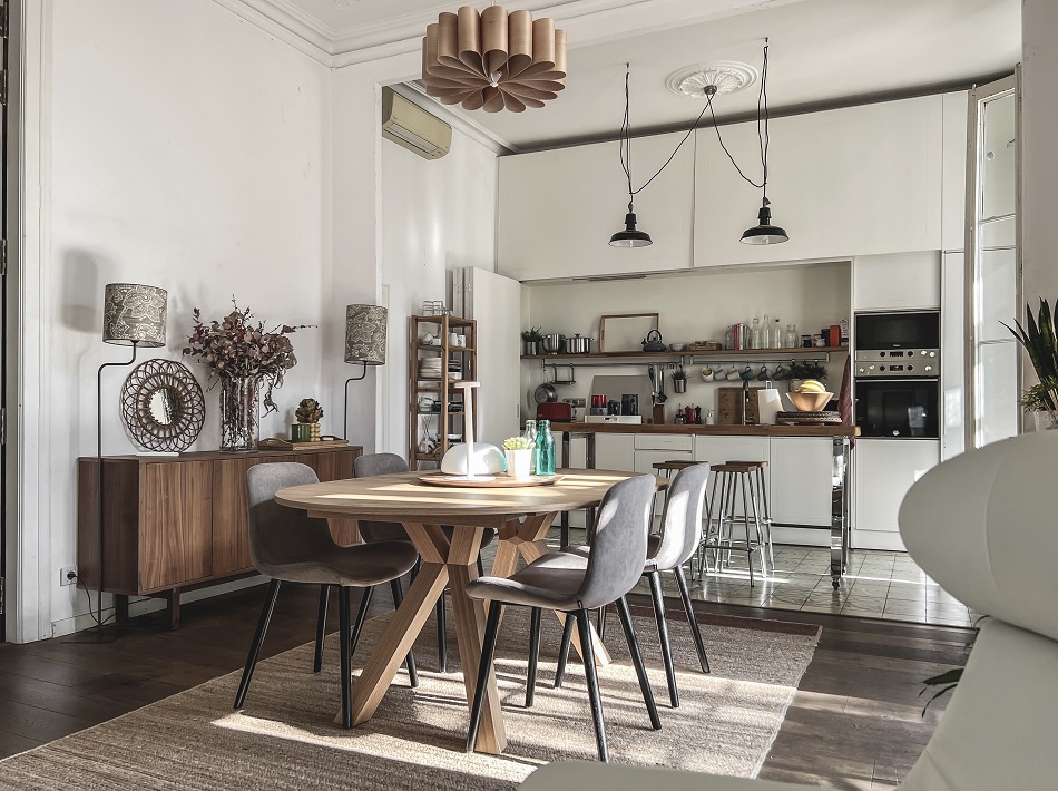 Se trata de un espacio con mucha luz natural, una sala diáfana salón comedor con una cocina, una galería acristalada y una terraza interior de isla del Eixample. Una cocina con una isla móvil de más de 3 metros es uno de los sets estrella de esta localización. La isla es un elemento que enriquece el espacio: es funcional y da mucho juego en la cocina. Una estación de cocina compuesta por electrodomésticos funcionales, vitro, cocina de gas y fregadero y grifo de diseño junto con unos paneles de luz que le dan un toque personal. La cocina uno de los espacios más trendy en decoración de los últimos años y aporta siempre un plus a los espacios, puesto que permiten actividades relacionadas con la gastronomía.