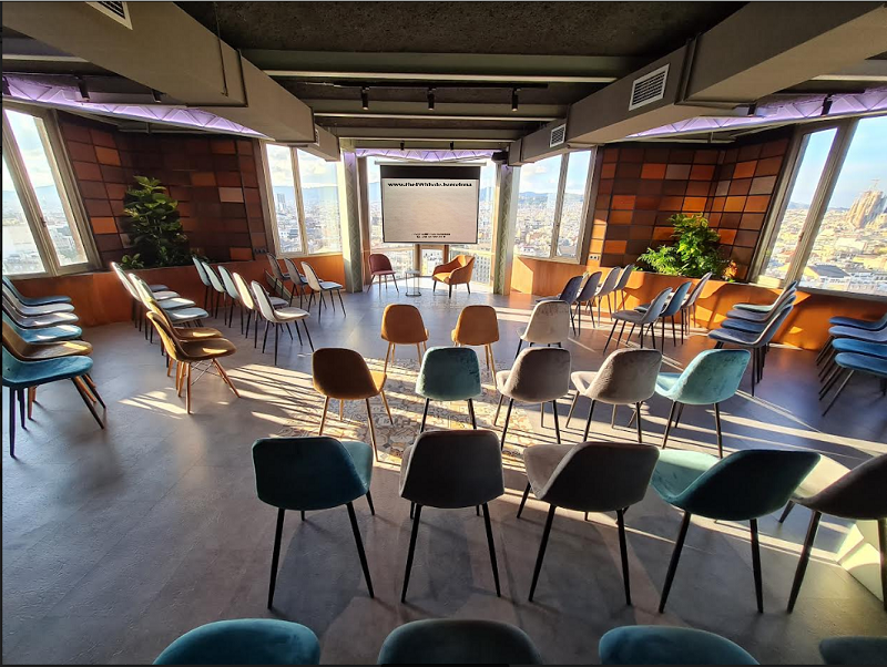 The 19th Hole se compone de 10 salas de reunión, todas con vistas al exterior, y con capacidades de 4 a 50 personas, además de dos despachos. Y el Auditorio en la planta 20 puede ser versátil y acoger hasta 120-140 pax poniendo el proyector y pantalla en un lado. Así que el espacio nos invita a acoger eventos de hasta 120-140 personas. Las plantas se pueden combinar, por ejemplo con sesiones de trabajo “breakout” en la planta 17 y sus salas más pequeñas, presentación plenaria en la más diáfana planta 20, y cóctel en la 19. Entre otras muchas configuraciones posibles.