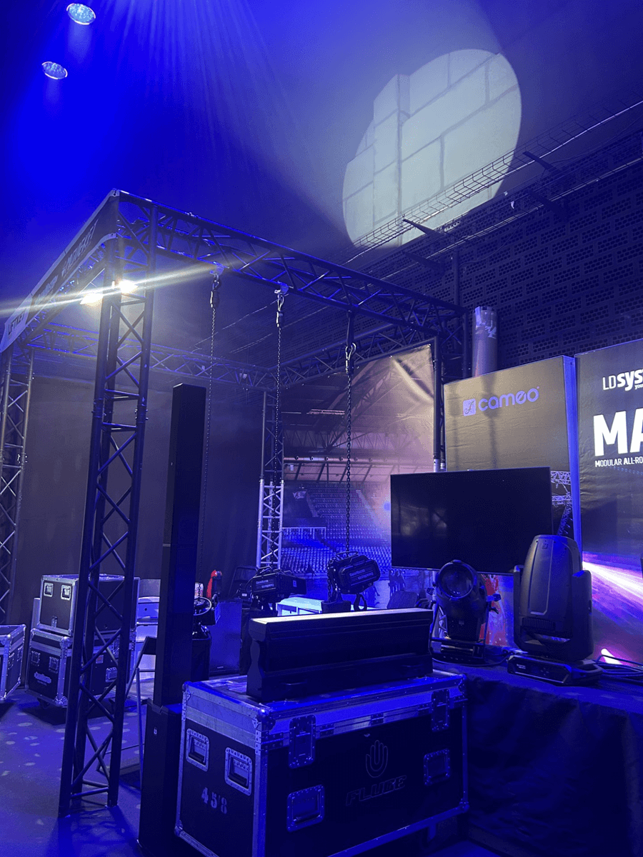 En cuanto a los expositores, nos encontramos con el stand de eqc, que nos presentó una innovación que permite optimizar el montaje: un totem LED plegable, de dos metros de alto, con dos paneles de 60cm cada uno (se pueden combinar varias pantallas para crear una estructura de 2m de alto, pero con el ancho que se quiera). Esta pantalla surge con un objetivo claro: que solo una persona pueda montar estas pantallas en un tiempo muy corto, y optimizar el transporte (al plegarse, cabe en un pequeño flycase). En cuanto a iluminación, vimos una barra de cabezas móviles de efectos con una fuente de luz principal de 5 LED RGBL de 120 W y un anillo de 120 LED RGB de 0,5 W.
